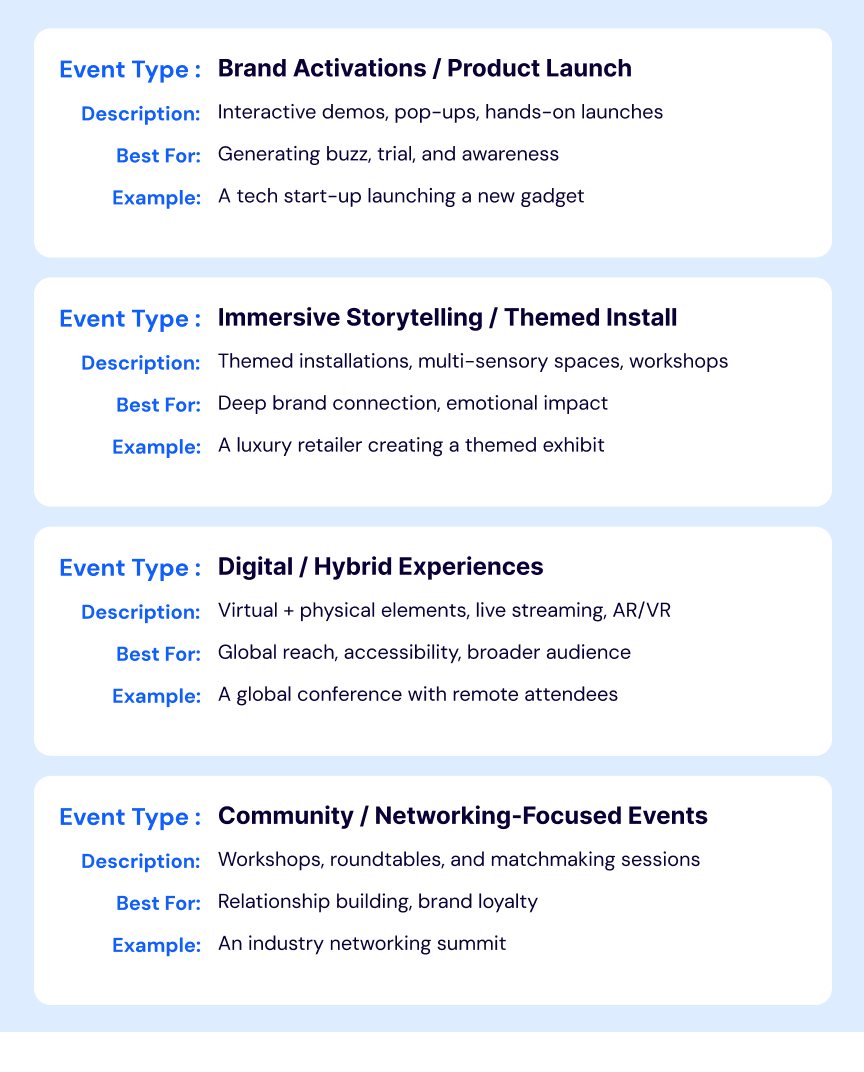 Experiential events come in multiple formats. Each of these formats is tailored to different goals, audiences, and engagement levels.