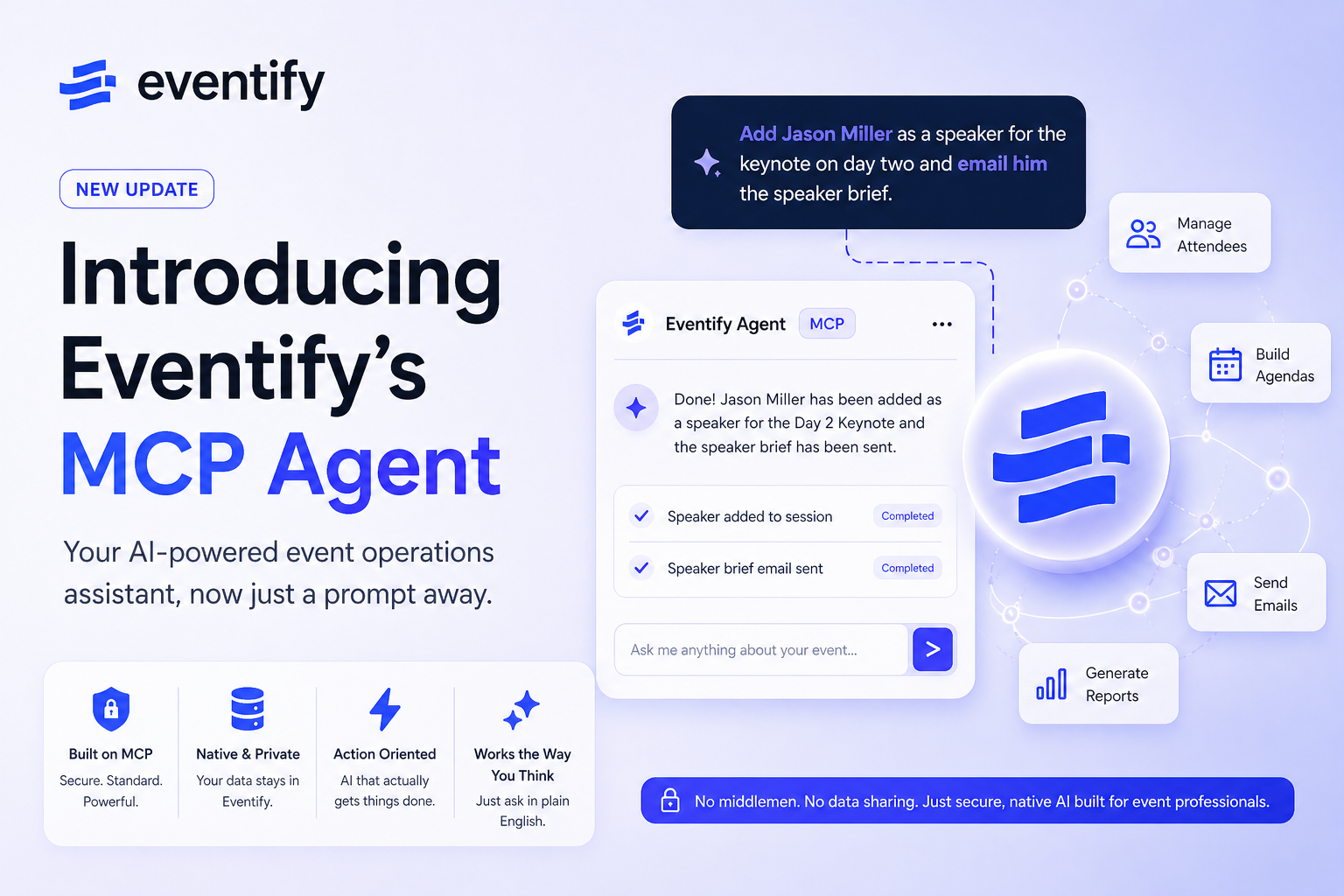 So we built our agent native to Eventify. The MCP server lives inside our own infrastructure. Your data does not leave. There is no Replit in the middle, no public agent host, no extra vendor walking around with a copy of your attendee list. The AI talks to Eventify, Eventify performs the action, and that is the whole loop. Clean, contained, and sitting under the same security and compliance framework as everything else we ship.