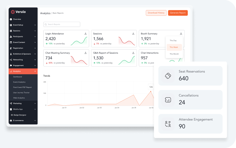 - Detailed Reporting and Analytics: vFairs provides insights on attendee behaviour, session attendance, engagement levels, and exhibitor performance so you can measure success and improve future events.