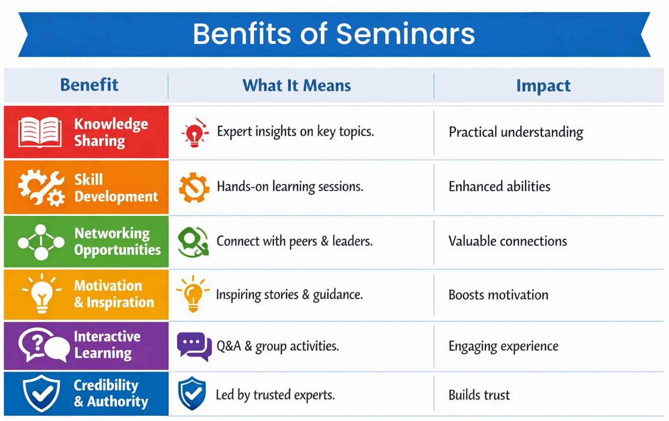 Seminars encourage active participation through interactions and practical problem-solving, which forces attendees to be present. There’s no distraction or multitasking, so attendees can do deep work. This cognitive focus leads to them asking context-specific questions, where learning moves from theory to practice. It also encourages better knowledge transfer and retention.