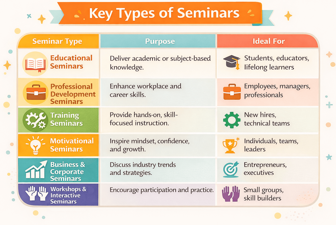 Seminars are tailored to the audience and the purpose they serve. For instance, a seminar designed for academic researchers will differ from one designed for sales professionals. Although they come in different formats and structures, the primary goal remains bridging theory and practice and achieving better knowledge transfer and retention rates.