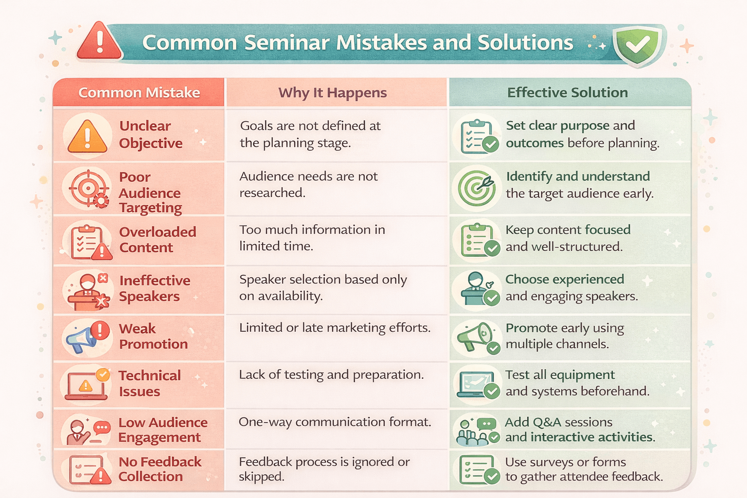 Solution: Define your seminar’s purpose clearly before planning anything else. State what participants should be able to gain at the end of the seminar. Let this guide your topic selection and speaker choice.