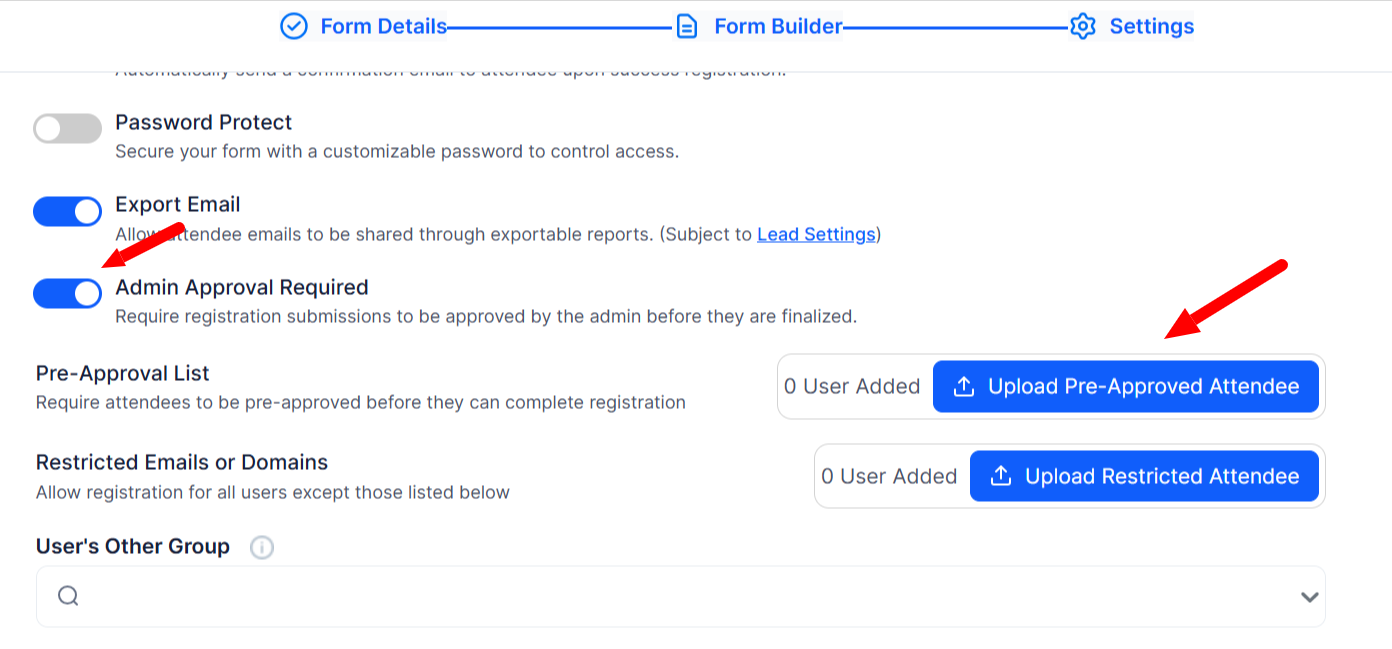 Once imported, only attendees whose details match the pre-approval list will be eligible for approval upon registering through that form. All other registration forms for your event remain unaffected and continue to operate under their own individual settings.