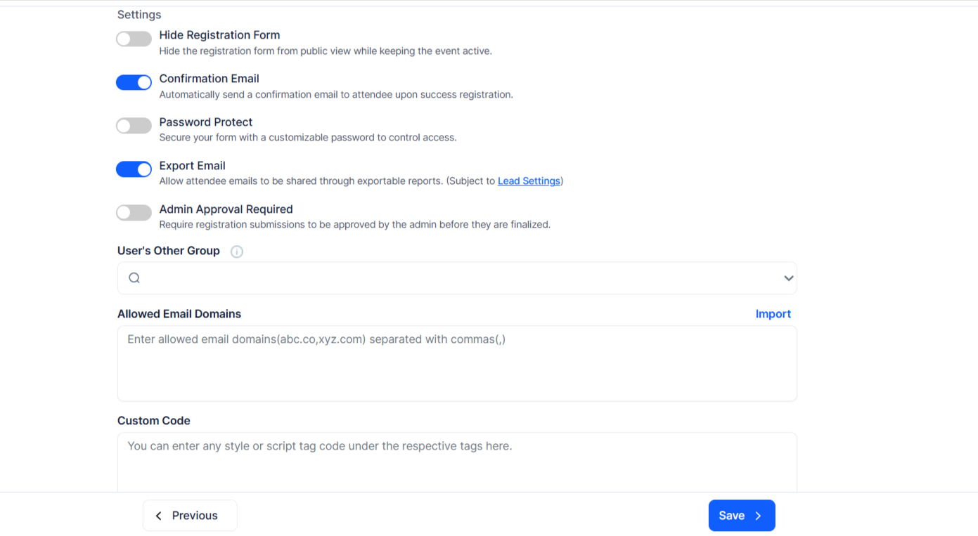 Restrict registrations to users from specific domains using the *.org wildcard format. This is particularly useful for member-only events, internal conferences, or any scenario where you need to limit access to a defined audience by email domain.